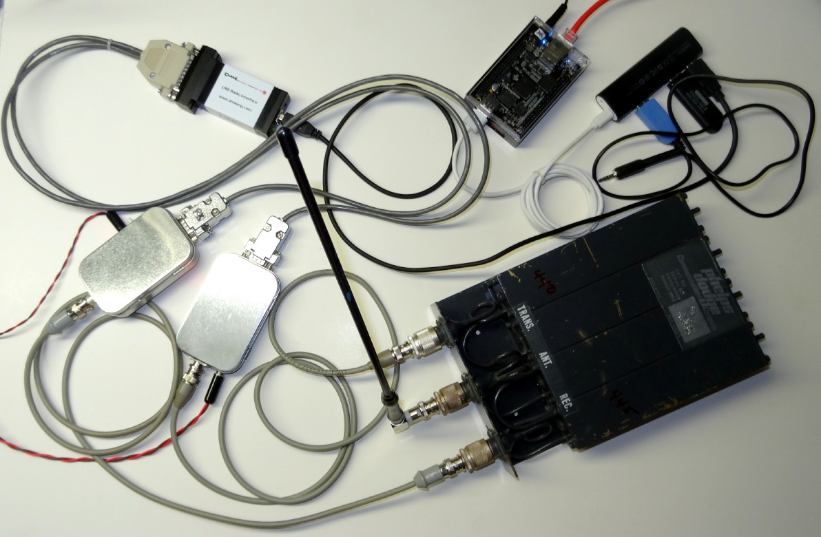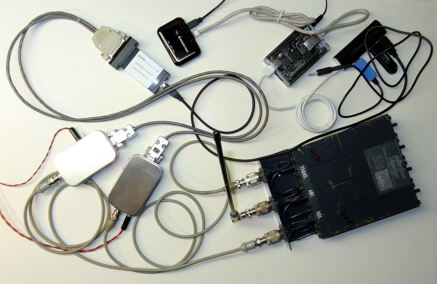 The photo shows the transceiver boxes to the left. Both are fed with 5V. Their antenna in/out goes to the Phelps Dodge duplexer and a whip antenna is connected to the center antenna terminal. The transceivers are connected to a DMK-URI USB interface to a USB HUB to the Beagle Bone Black. Also plugged into the hub is a 32GB Memory card, used for backups, and a USB to serial adapter, used to program the transceivers The next photo shows the same repeater only using the IOGEAR wireless Ethernet adapter. The entire repeater could be made portable with a battery and regulator supplying the 5 volts.