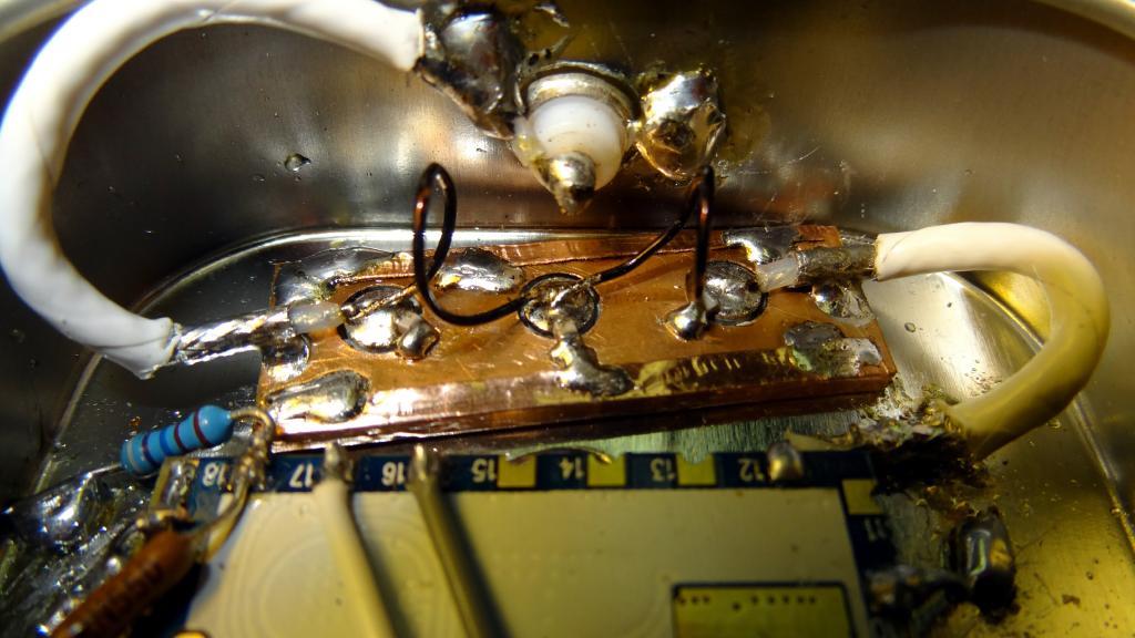 Closeup views of the low pass filter assembly. The filter consists of two inductors and three capacitors. The inductors are 1 turn of #22 wire about .2 inch in diameter. Theses are wired in series across three isolated pads on the copper board. The outer pads have a 10 pf chip capacitor to ground and the inner pad has a 15 pf to ground. Either end could be input or output. The first generation filter used #15 wire and a larger board with milled pads rather than pads cut in nice circles. Both filters worked equally well for the intended purpose with the larger #15 filter being slightly better in the stop band. Copper tape is wrapped around the double sided board and then soldered to the tin chassis.
