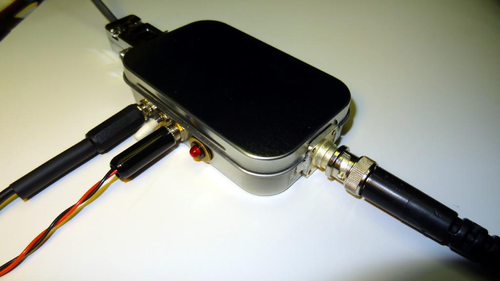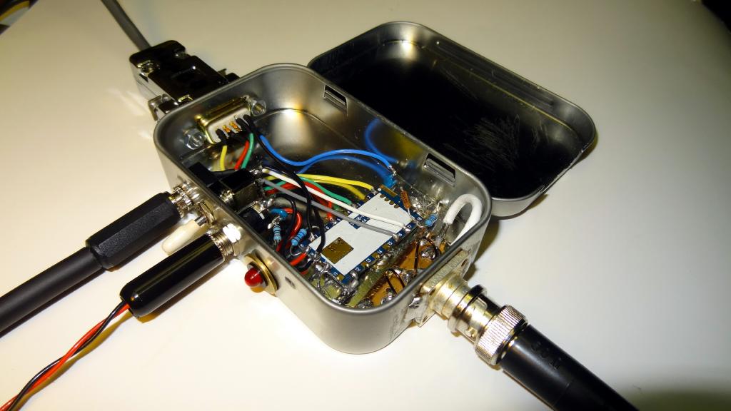 The DB9 on the left is wired the same as the data jack on the Alinco DRx35 transceivers and the levels and signal polarities are the same allowing easy swapping with my Alinco transceivers. On the bottom left is a 1/8" mini stereo phone plug which brings in the serial RXD/TXD signals for programming. The connection is only needed for programming and can be disconnected during use. To its right is a power LED. The +5 power input is a coaxial plug on the upper right and the antenna connector is a BNC on the right.