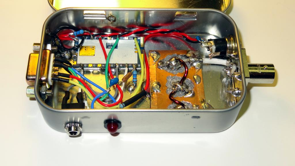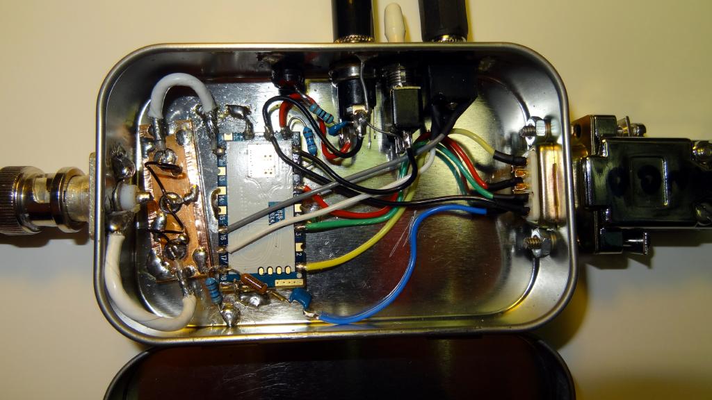 Inside the SA818 module is mounted at the upper left. The shield of the module is tack soldered to the tin enclosure. A low pass filter was constructed on double sided copper board and is soldered to the tin on the right. Various low pass filter designs will be discussed below. The only discrete components are a 10K from +5 to pin 6 and a 10K from pin 18 to ground with a 47K and 10uf in series from pin 18 to the DB9. This sets the TX (mic in) level to equal those of the Alinco.