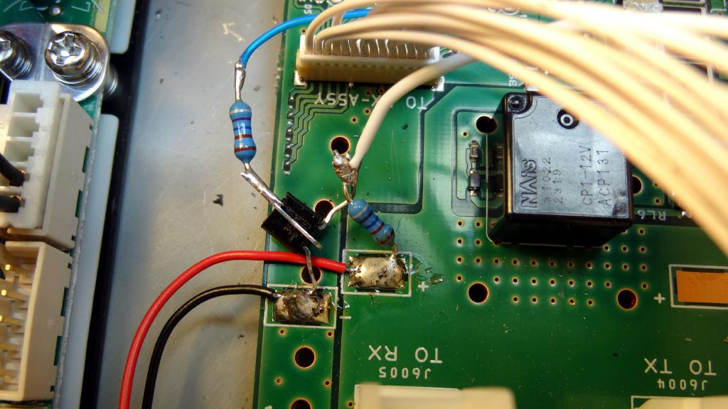Solder one end of a wire about a foot long as shown to the center pin of the 10 pin connector. The row away from the rear connectors. The photo shows this best. Route the wire up through one of the nearby holes in the board. Remount the board but leave the connections off for now. Unfortunately this connection is the opposite COS polarity that is desirable for Allstar, positive going on signal. When possible it is always better to have a negative going COS level on signal feeding the DMK URI. A 2N3904 was added near the front of the board where the red and black leads that come from the module in front of the board are connected. The emitter is soldered directly to the ground (black wire) pad. The collector is connected through a 10K resistor to the +12V (red wire). The wire from the back connector is wired to the transistors base through a 10K resistor. Then another wire is connected to the Collector and run to the breakout board. The COS line to the external DB25 connector (white wire in the photo) is removed from the yellow lead to the RX mini USB connector and connected on a separate pad to the lead from the collector of the 2N3904 (also a white wire in the photo). Thus the positive going COS from the rear connector is inverted and sent to the DB25 pin 8 for connection to the DMK URI. Again the photos below are the best way to understand this.