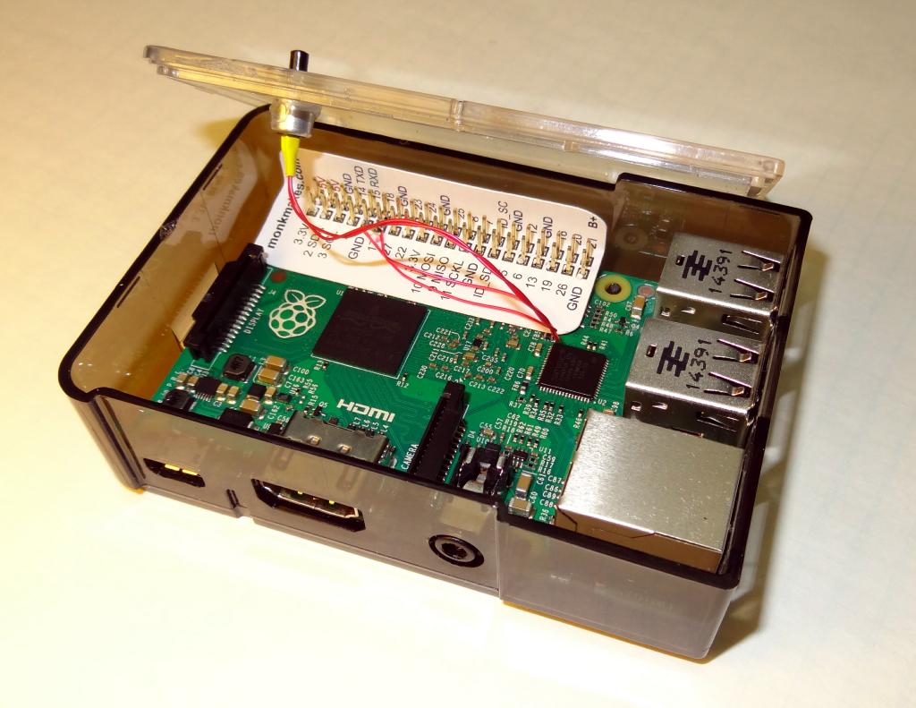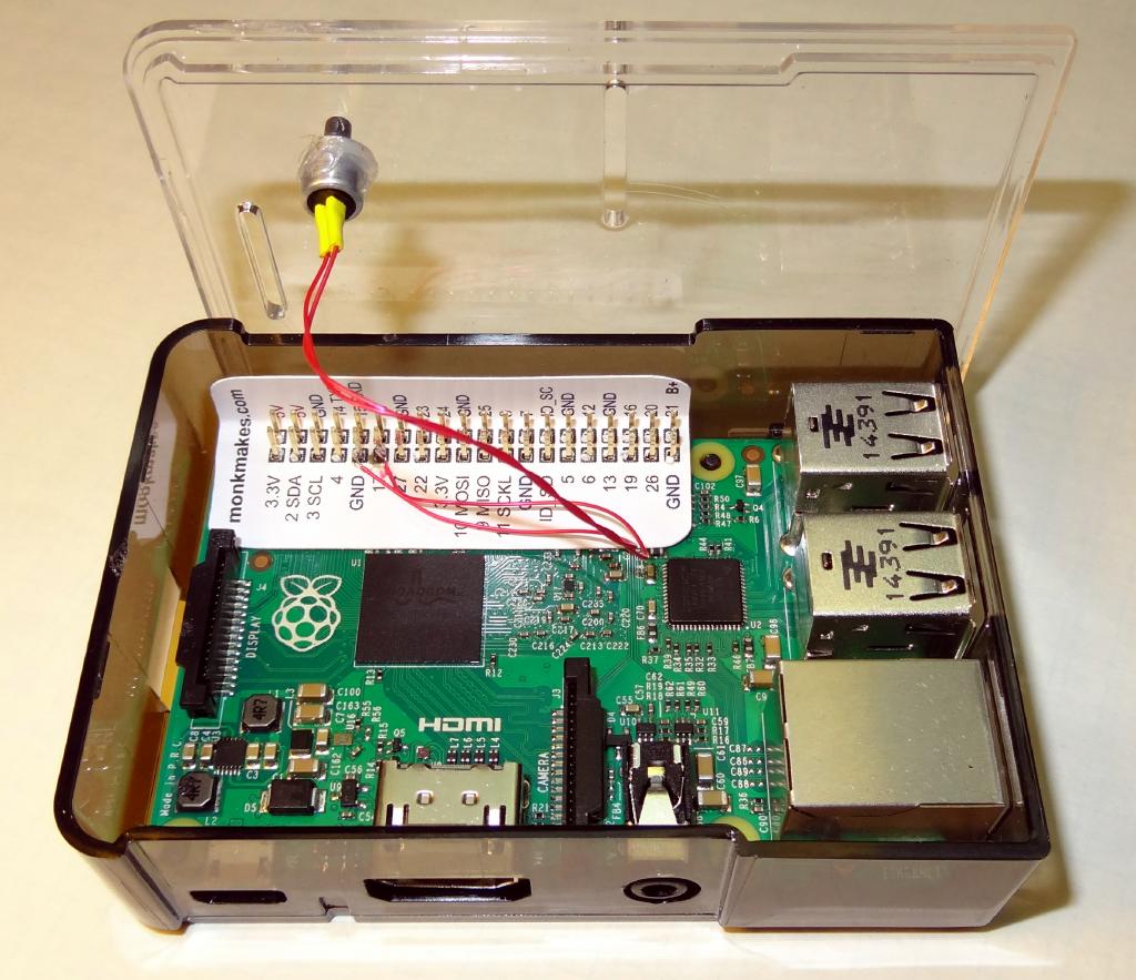 The switch is just a momentary single pole push button mounted on the case cover. It is wired to pin 11 (GPIO0 or GPIO17 depending on the stardard used. I use the wiringpi standard or GPIO0. The other side of the switch is wired to ground, pin 9. See the photos below for more detail.