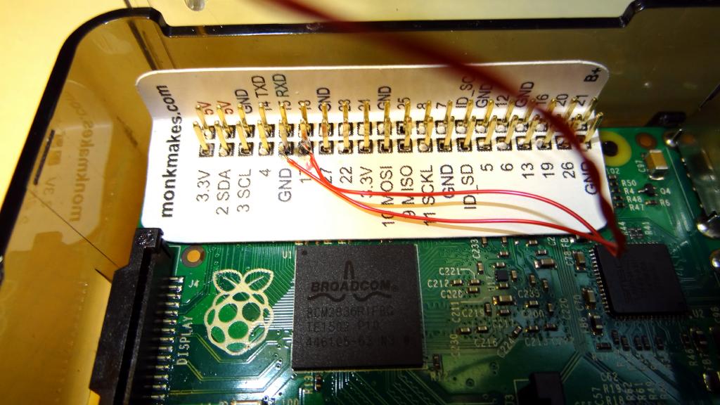 The photos show an optional pin identification shield (available from Adafruit) placed over the pins. The wires are tacked at the bottom of the pins making sure to not get solder further up the pin. This will allow a 40 pin female connector to still be placed over the pins for other I/O functions. More information on RPi GPIO pinouts can be found at these sites: