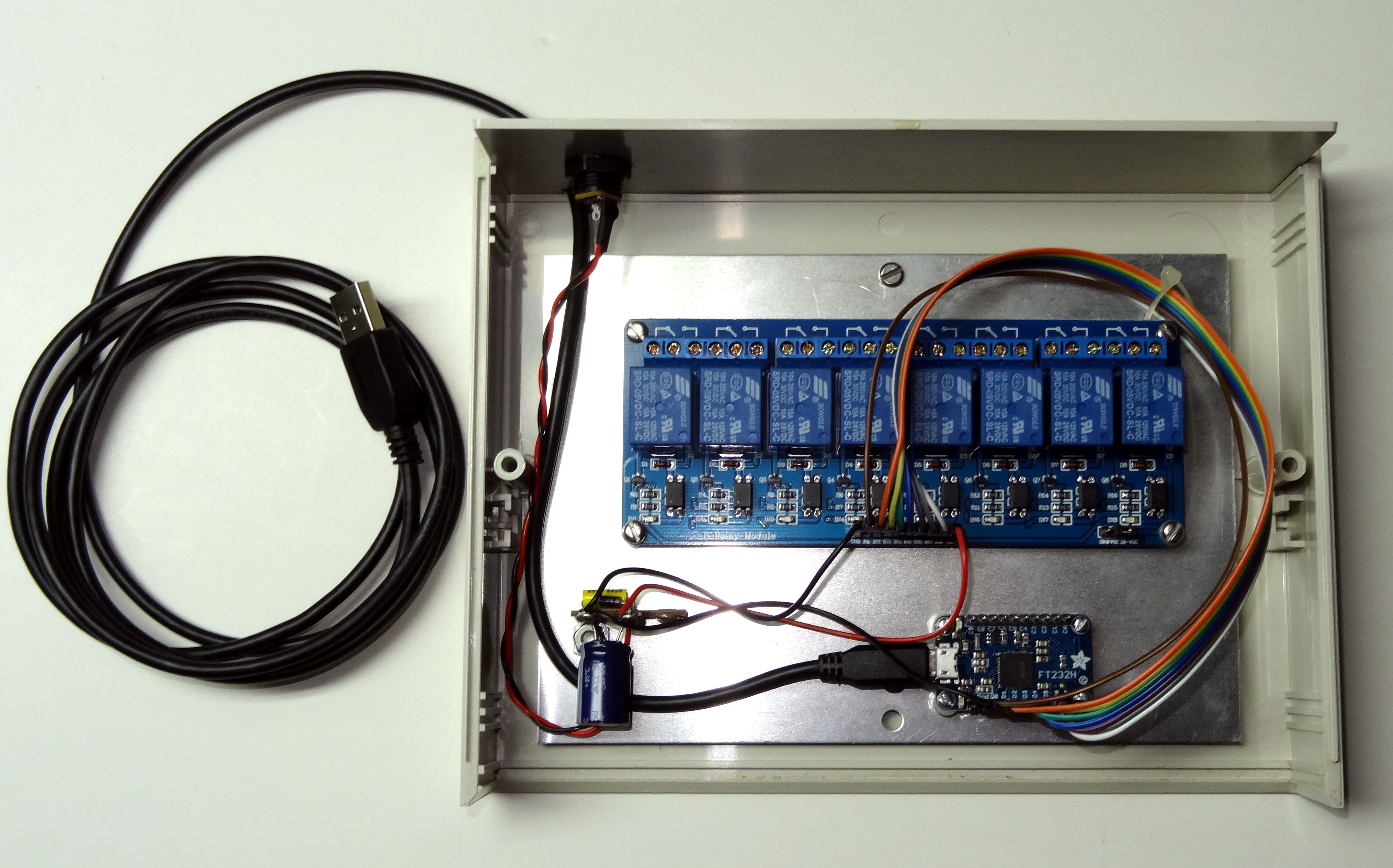 The FT232H is a really nifty chip that allows you to control serial, SPI, IC2, and GPIO ports from USB. I mocked one up and instantly had control of 8 relays. The board supports a total of 16 I/O lines in any combination of input or output. All lines are 3v or 5V capable. The board itself is powered from the USB port it connects to. The USB connector on the board is a micro-USB.